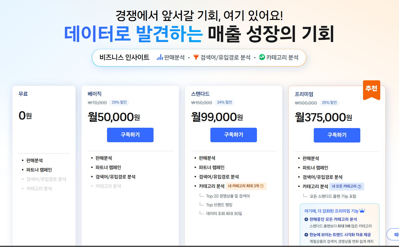 그로스 페이지에서 비즈니스 인사이트라는 판매분석 툴이 생겨서 오 왠일인가 했는데 유료화 되었다